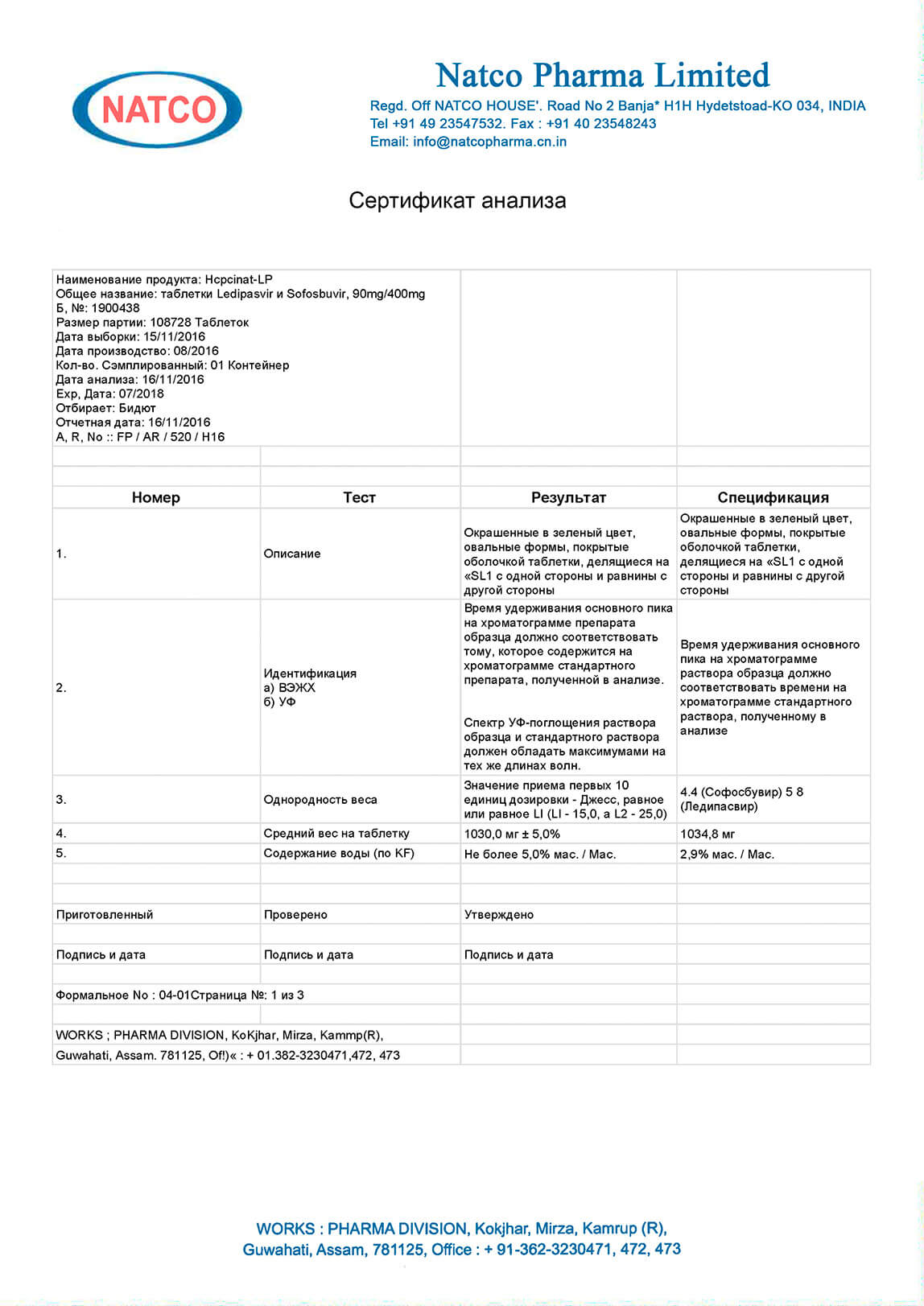 Hepcinat LP («Гепцинат ЛП») производит индийская фармацевтическая организация Natco Pharma по лицензии компании-производителя. Препарат позволяет достичь отличных результатов в борьбе с вирусом.